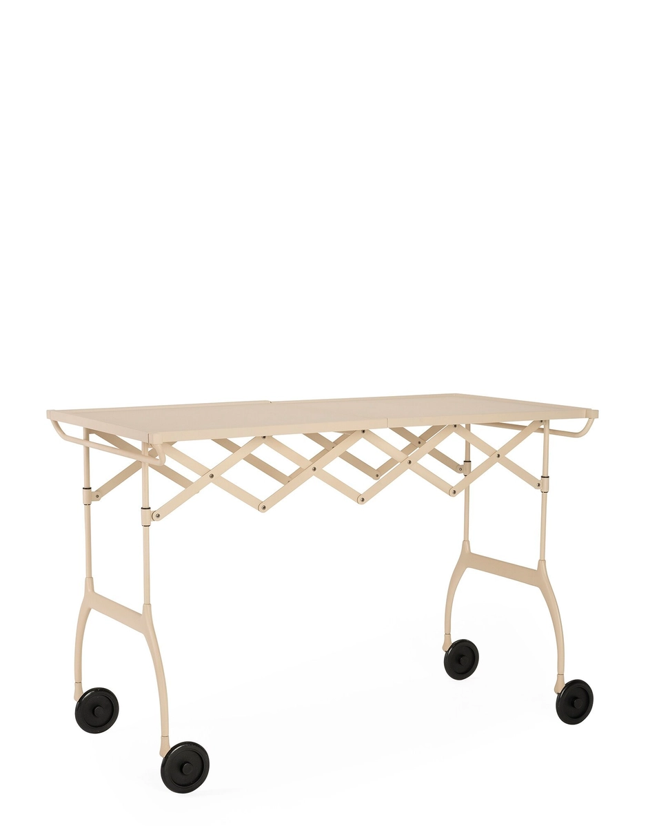 Besides being a practical trolley characterised by the successful combination of plastic and metal materials, Battista is proposed as an extensible and folding table, ideal for buffets and cocktails or for use as an occasional table.