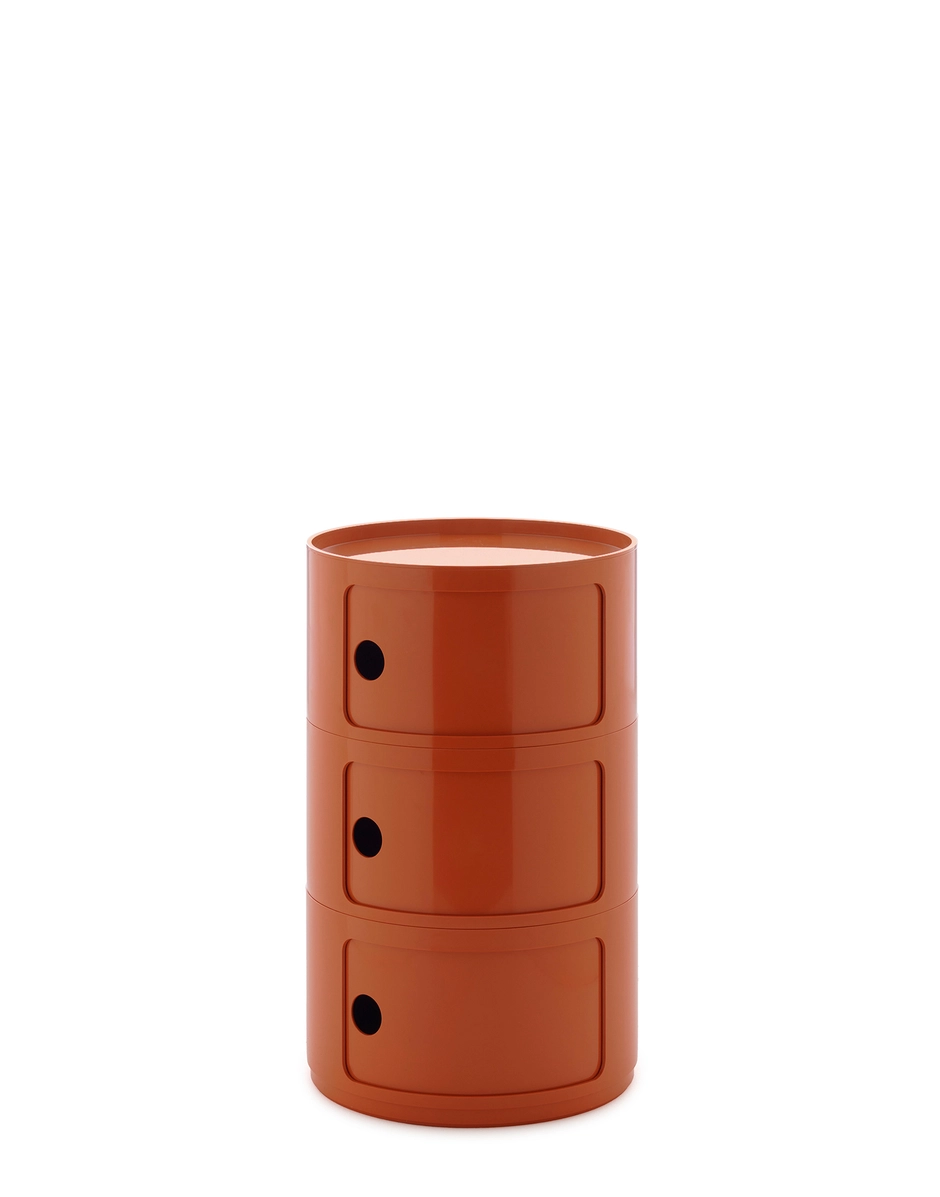 The 42 cm round version of Anna Castelli Ferrieri’s I Componibili now comes in an all-new look thanks to a new industrial print that enhances both quality and appearance. There are more colours to choose from too, with the addition of nuances already available for the 32 cm size complemented by original new shades that blend contemporary taste with elegant references to the past. Available in configurations of 2 or 3 indivisible elements, this version of I Componibili is the latest technical evolution of a classic from the Kartell catalogue. Available in Bordeaux, Dove Grey, Orange, Petroleum, Green and White.