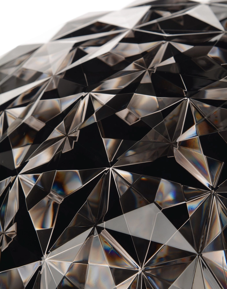 A family of lamps: suspended, for a coffee table and with a metal structure, and the most recent floor version of the lamp is available in two heights: 130 and 160 cm. The distinctive trait is the shape of the slightly elliptical transparent diffuser, which is characterised by a multi-faceted surface, both inside and out, which creates a rich tapestry of reflections.