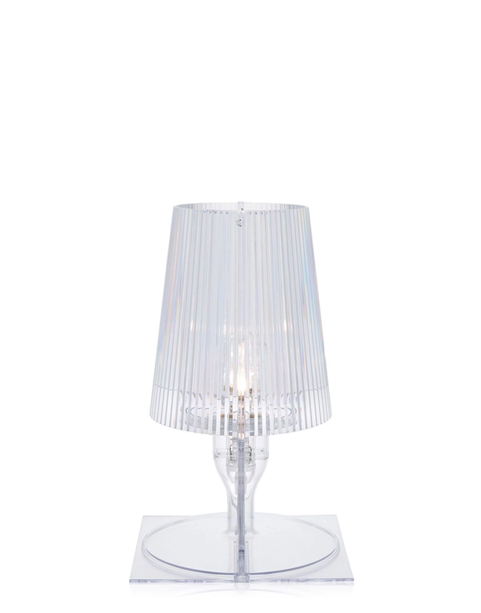 The classic icon of the bedside lamp is revisited by Kartell's technology to become an industrial product in a variety of colour shades. The shape of Take is the result of the joining of two specular parts: two flat, rectangular sheets which, from being two-dimensional at the centre, take on the shape and volume of a "semi-lamp". The internal pleating of the diffuser embellishes the object, creating, when lit, a play of reflections.