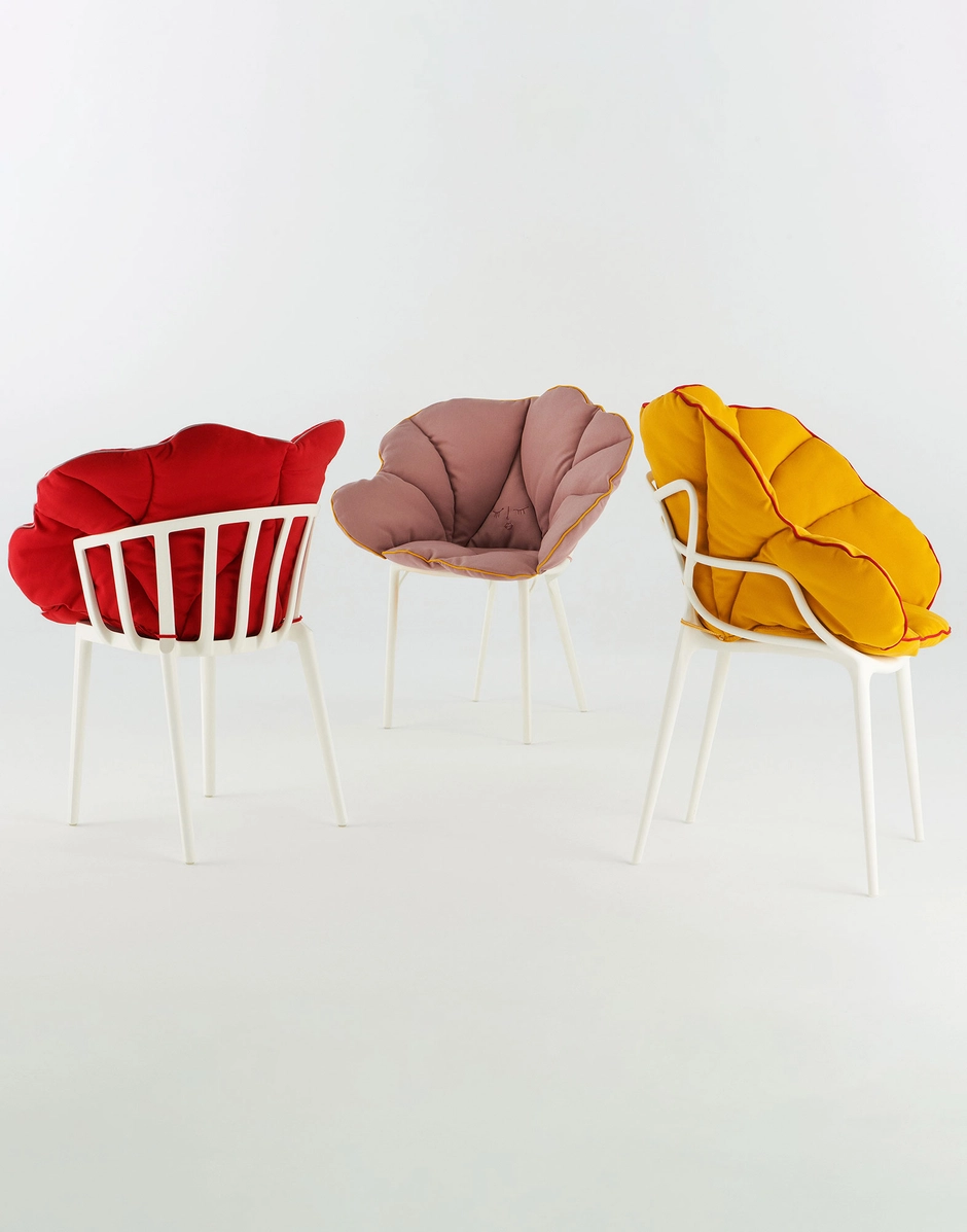 Inspiriert von der Magie sprechender Blumen aus Märchen interpretieren diese Kissen die Natur auf zeitgenössische Weise neu und verleihen den Sitzmöbeln von Kartell eine zusätzliche poetische Note.