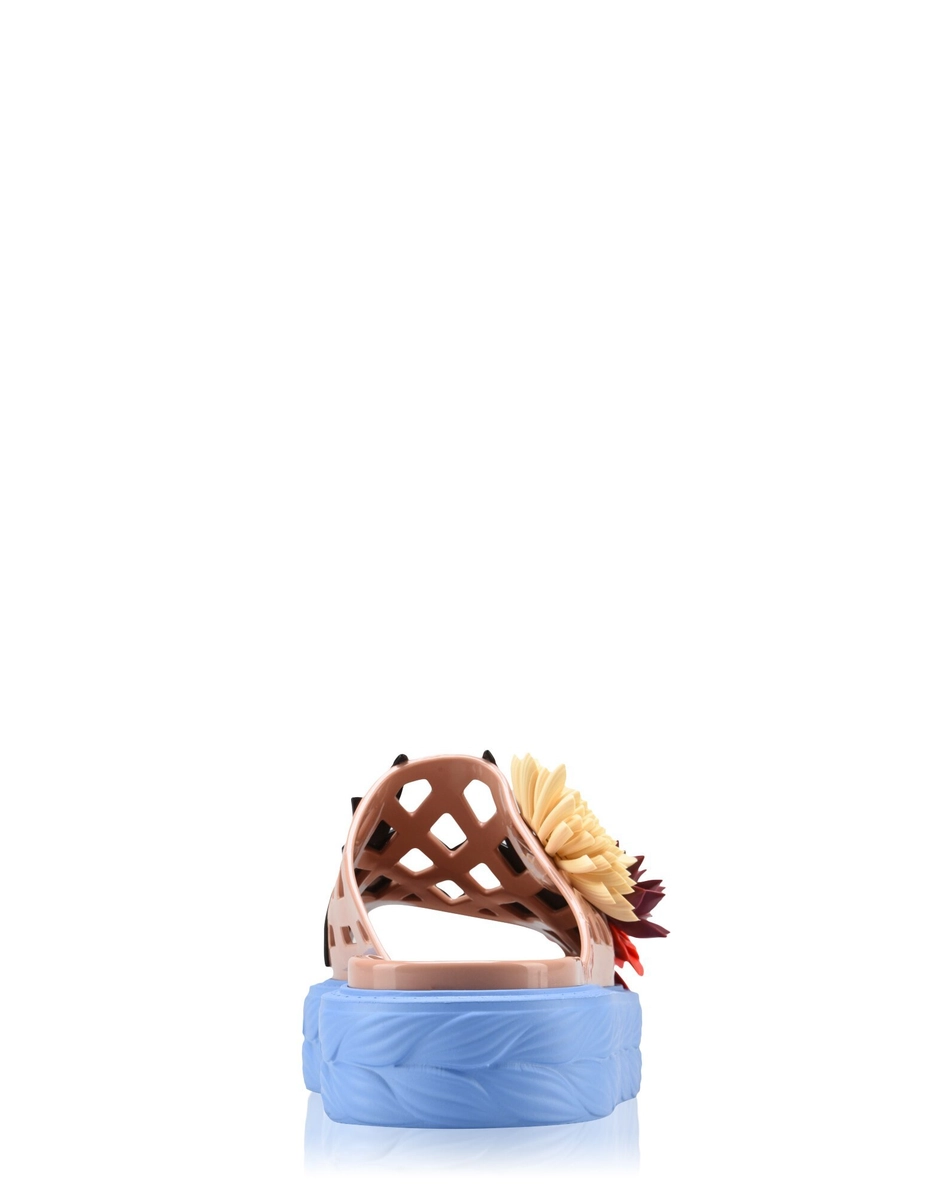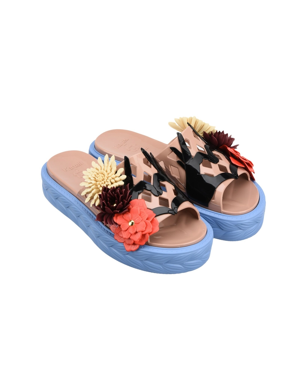The Claudia sandal comes in different colour variants. The motif consisting of two hands joined in a heart shape characterizes the upper band, to which three-dimensional artificial flowers have been affixed.