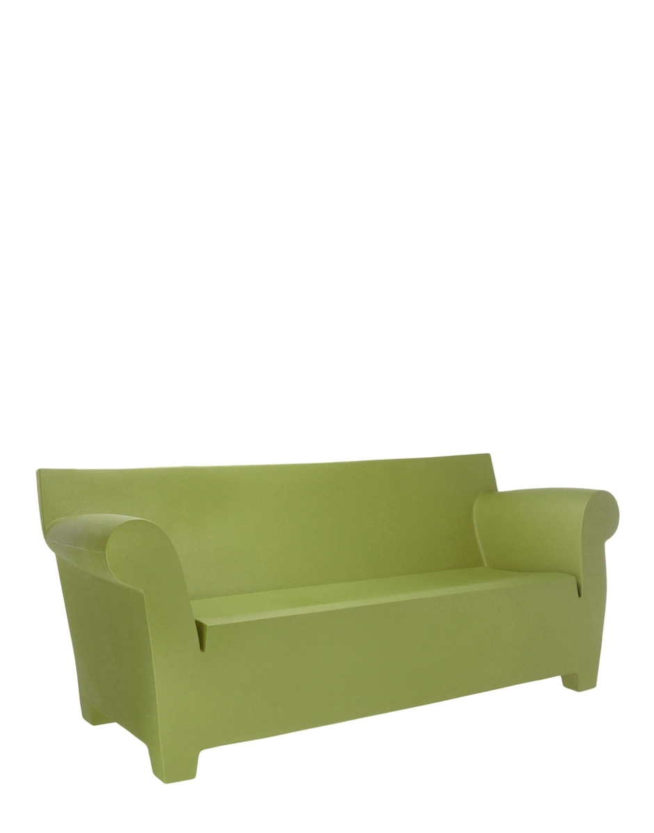 Bubble Club is the industrial sofa in which rotational moulding technology has enabled Kartell to mass produce. A large two-seater sofa, characterised by the soft line of the armrests which contrast with the more rational line of the backrest; an essential silhouette, reminiscent of “grandma's sofa”. Bubble Club joins the armchair and occasional table, made in the same finishes and colours, to become a real family, an "industrial lounge" for furnishing a garden, a poolside or a terrace.