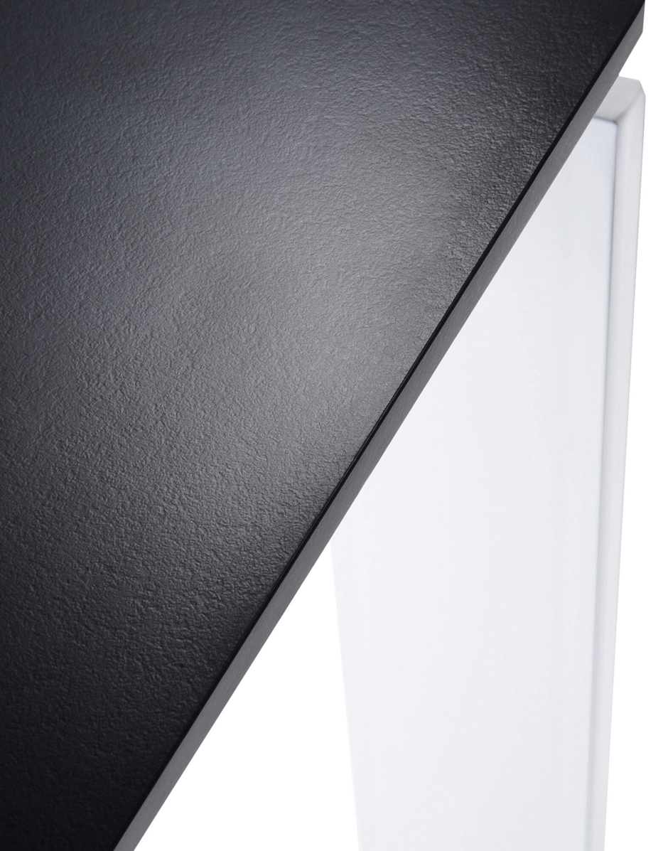 Une table fonctionnelle et raffinée au design rigoureux et géométrique. Grâce à l'élégante solution conceptuelle, la position du mince plateau permet d'introduire facilement des blocs à tiroirs ou de rangement pour matériel informatique. Il est possibile d'y accoler plusieurs éléments afin de former des îlots opérationnels dans un lieu de travail.