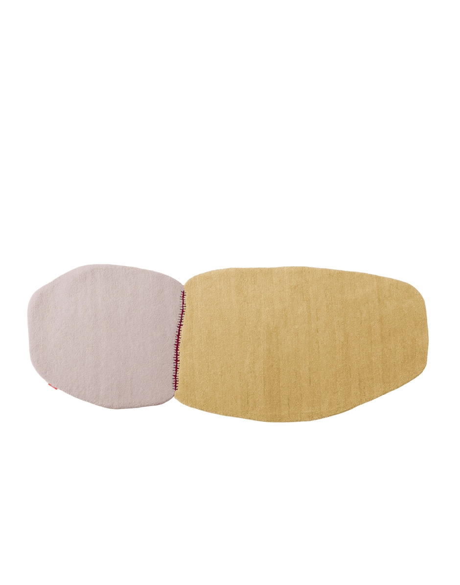 Die AALAND-Teppiche zeichnen sich durch ein besonders originelles und unverwechselbares grafisches Muster aus. Das Design besteht aus zwei organischen, abgerundeten Formen, die jeweils unterschiedliche Füllungen und Texturen aufweisen, wodurch ein interessanter visueller Kontrast entsteht. Diese beiden Formen, die eine gewisse visuelle Eigenständigkeit bewahren, sind durch ein grafisches Element verbunden, das als eine Art stilisierte Naht interpretiert werden kann.