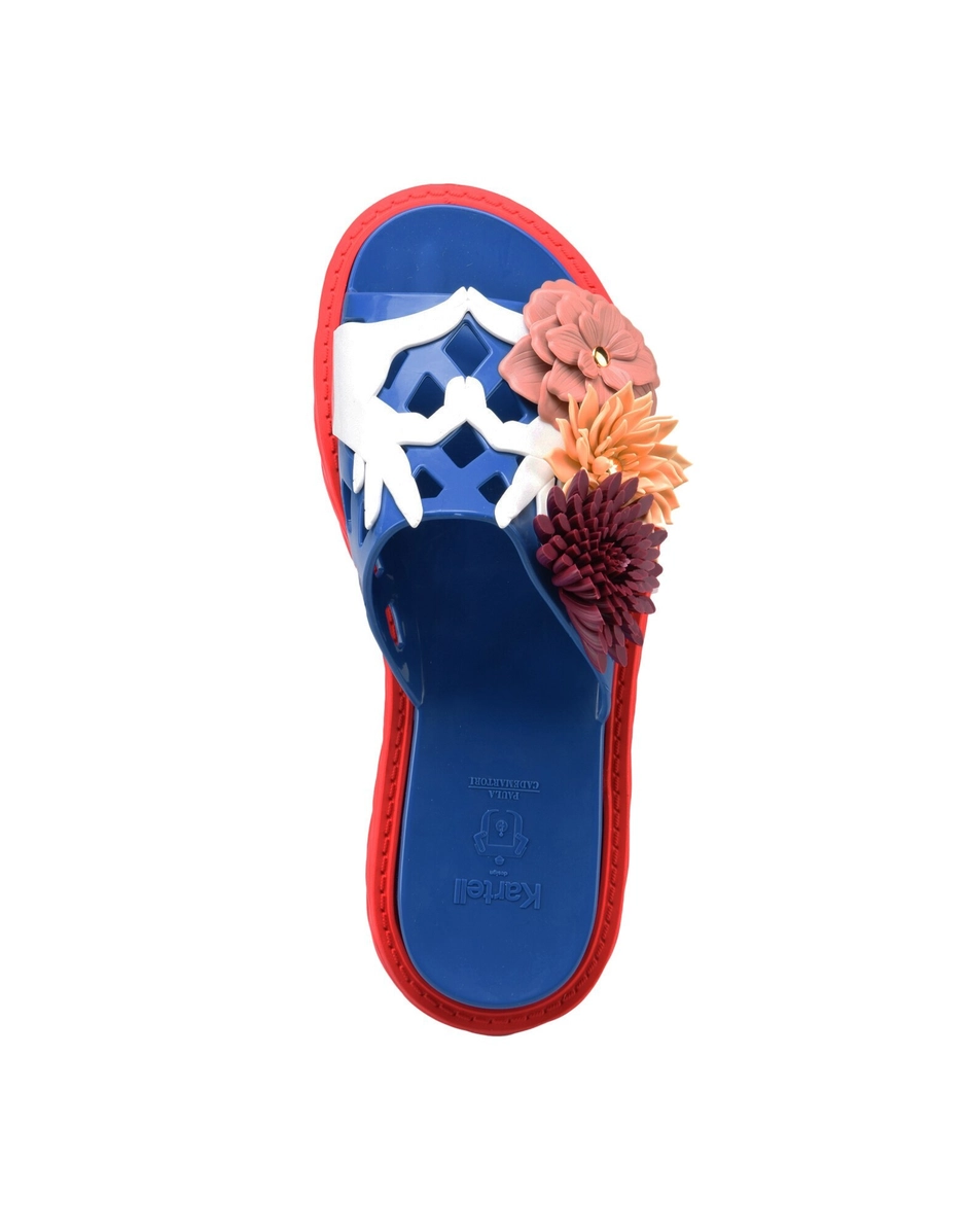 The Claudia sandal comes in different colour variants. The motif consisting of two hands joined in a heart shape characterizes the upper band, to which three-dimensional artificial flowers have been affixed.