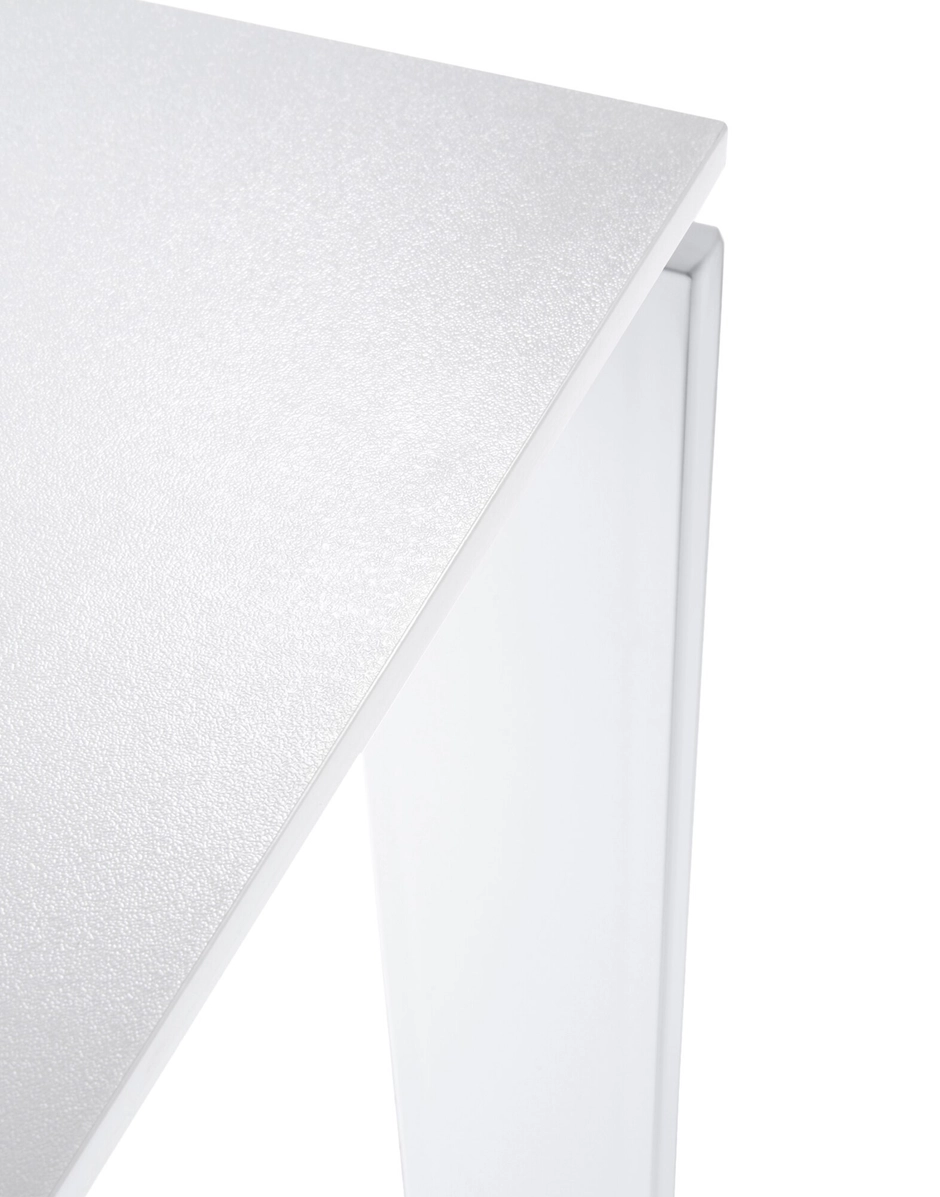 This functional and refined table also has a strict geometric design. Thanks to the elegant design solution, the position of the slim table top allows for the convenient positioning of drawers or storage furnishings for computer hardware. They can be placed side-by-side to form office workstations.