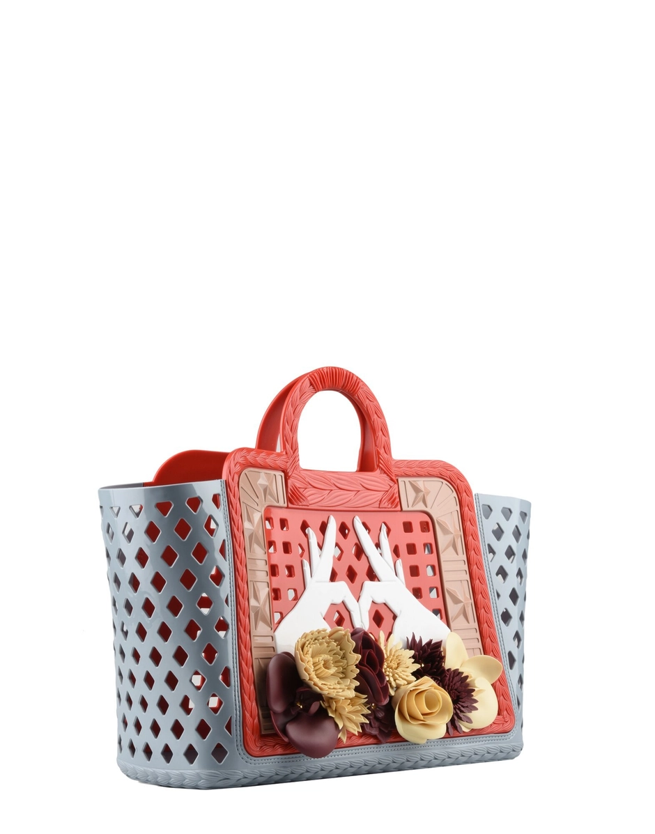 The injected plastic Parati handbag plays with woven patterns and is offered in different colour combinations. On the side of the bag, two hands form a heart to remind us of the theme of universal love, while truly special reproductions of peonies, buttercups, orchids, anemones and dahlias in a variety of shapes and colours take us to far-off exotic atmospheres.