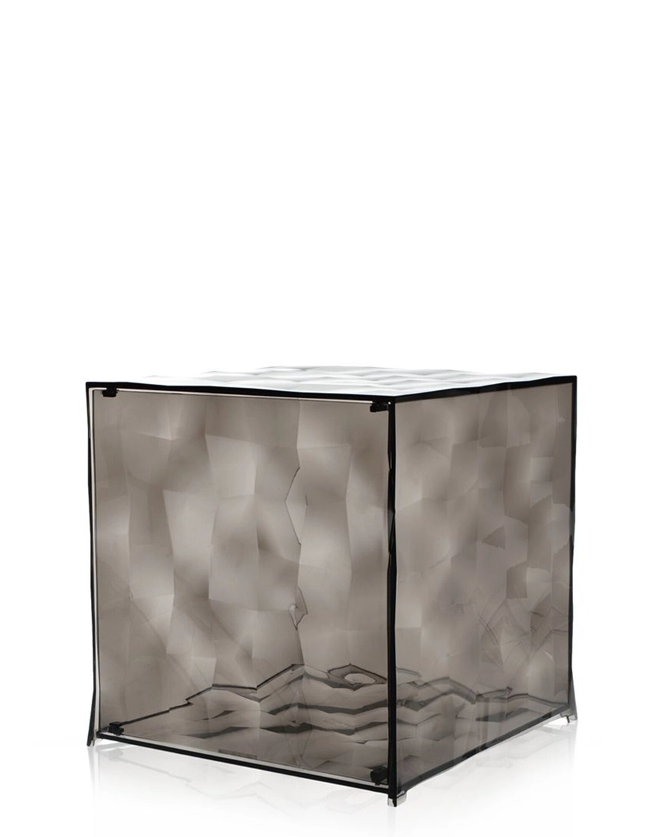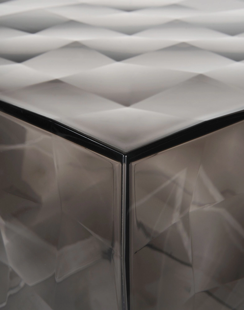 Optic is a container cube which comes in two versions: closed with a door or with one open side. Its surface is strikingly decorated with square based transparent or mirrored pyramids, slightly in relief, which create a strong visual impact. Optic measure