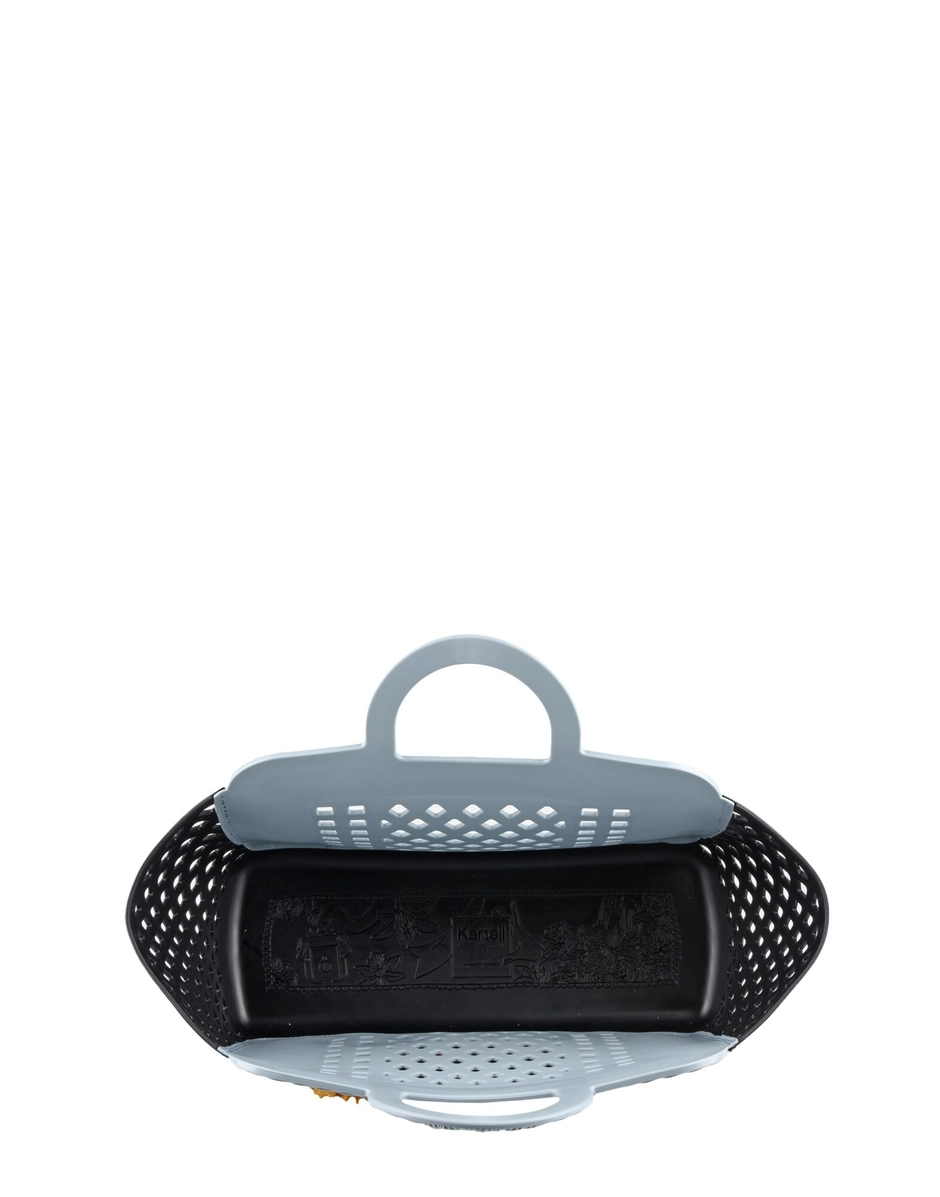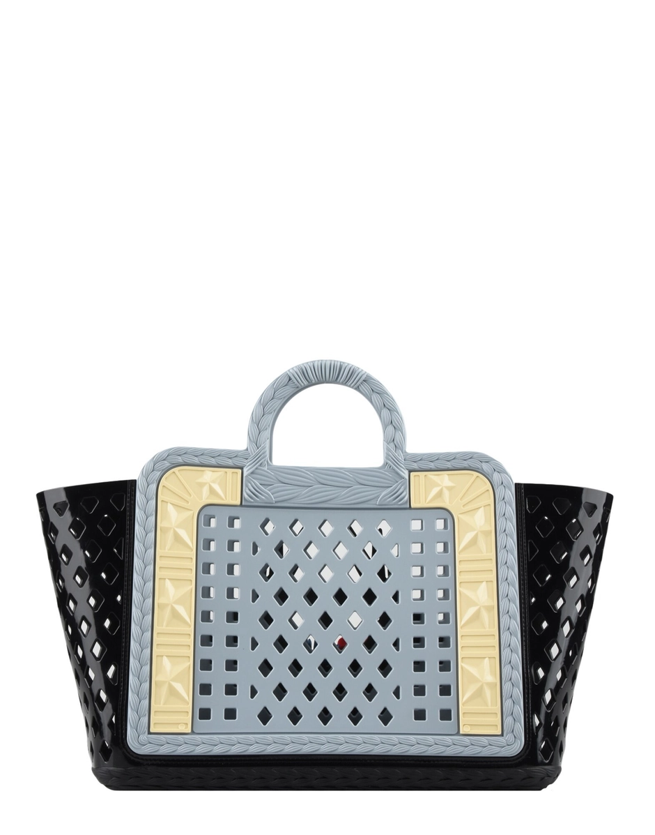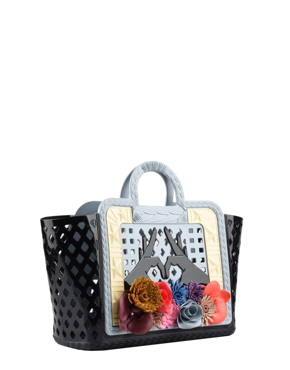 The injected plastic Parati handbag plays with woven patterns and is offered in different colour combinations. On the side of the bag, two hands form a heart to remind us of the theme of universal love, while truly special reproductions of peonies, buttercups, orchids, anemones and dahlias in a variety of shapes and colours take us to far-off exotic atmospheres.