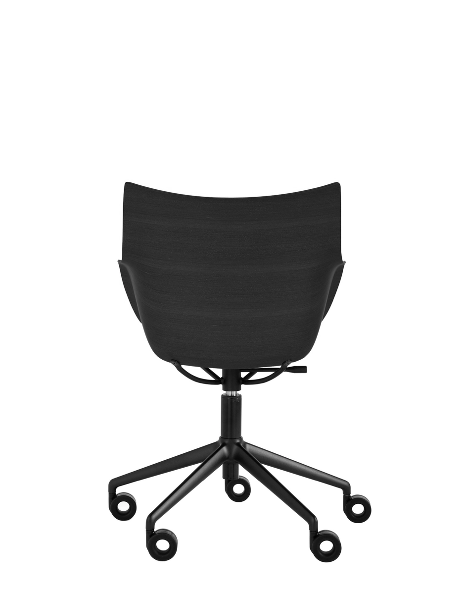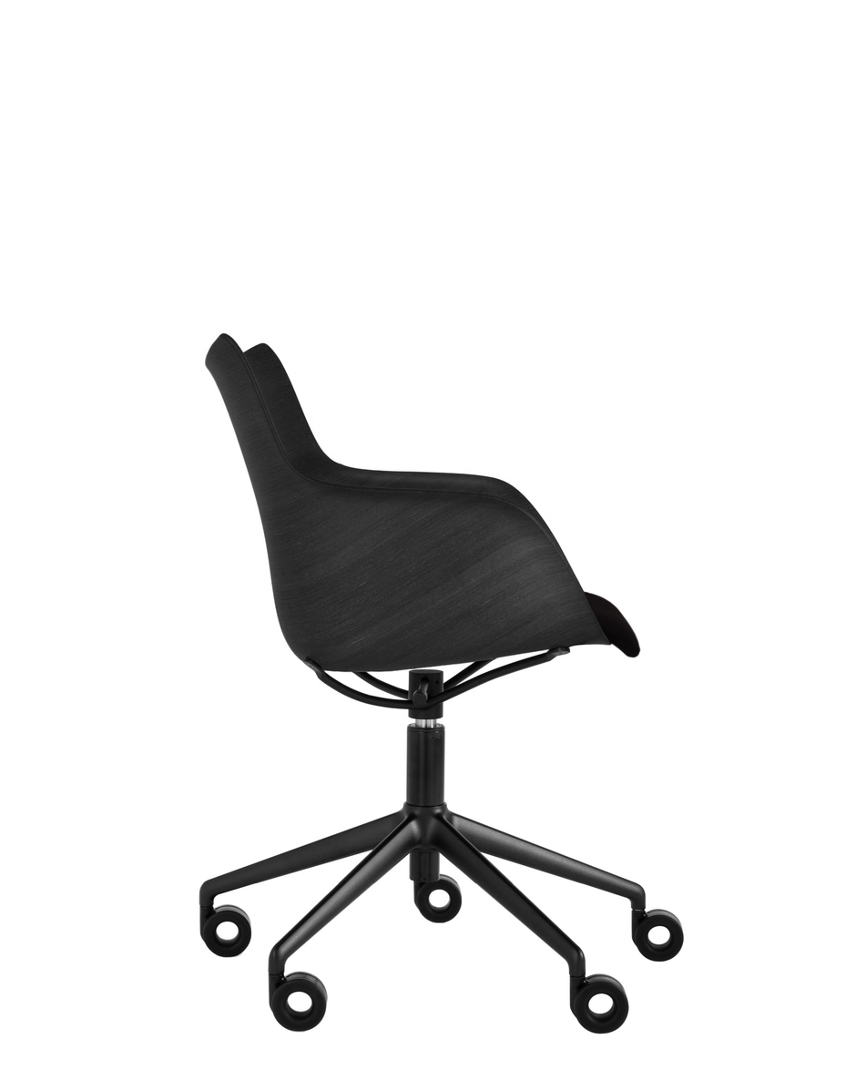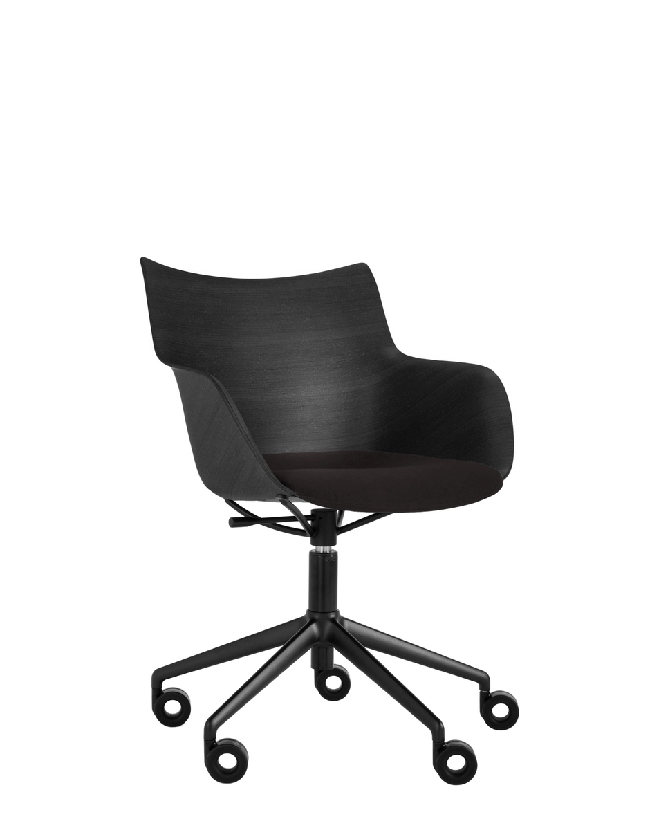 These brand-new rotating armchairs on wheels are the latest addition to the armchair collection. Q/wood is characterized by a woodworking, combining timeless elegance with contemporary forms, and is available in three colour variants: light wood with a white seat and chrome structure, dark wood with a black seat and chrome structure or dark wood with a black seat and black structure