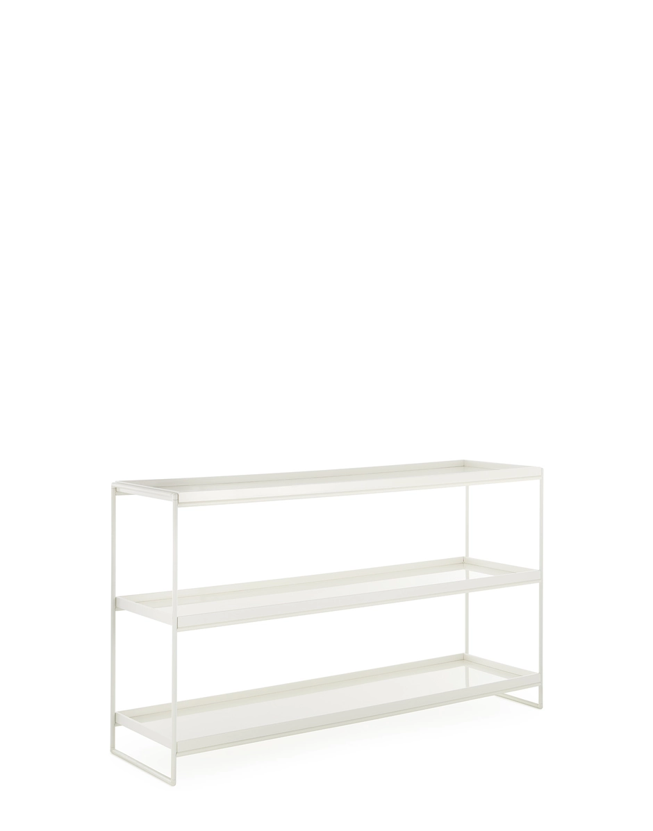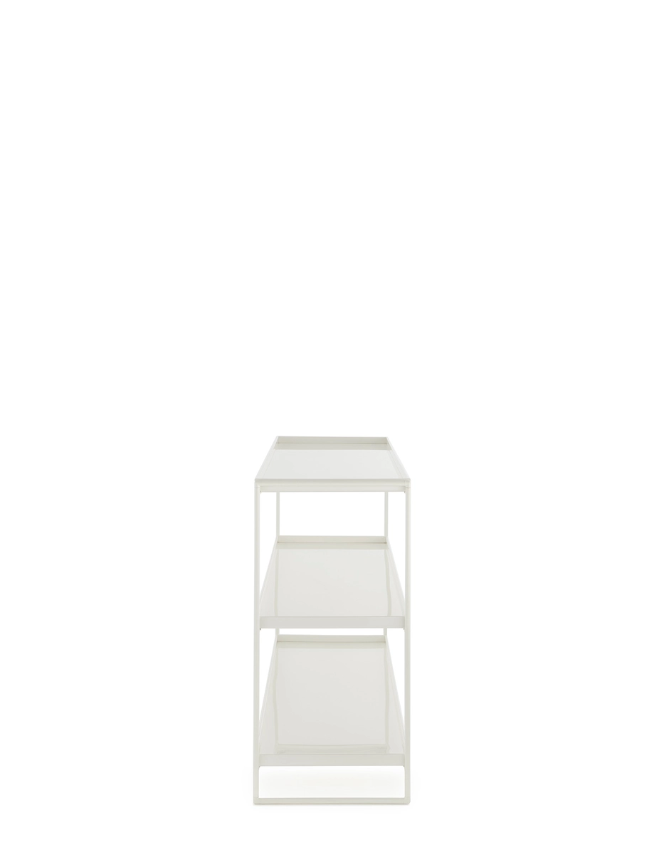 TRAYS is a versatile shelving system for home or office use. The concept is that of a set of tables, trolleys and shelves with surfaces inspired by traditional Japanese lacquered trays in both design and finish. The TRAYS collection is now bigger than ever, with new heights and shapes covering a wider range of modern needs and functionalities. TRAYS also boasts a new colour palette, with metal frames now in tone on tone shades.