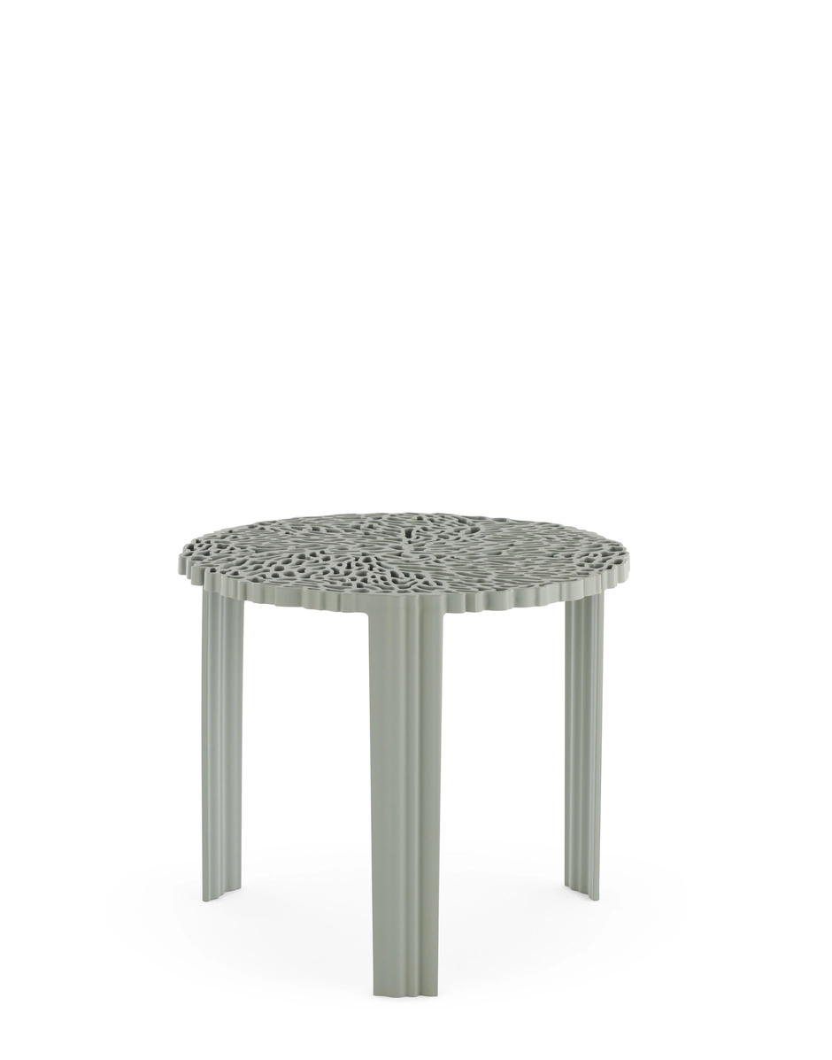A line of tables in three heights. The surface of the T-table top alternates fullness and space to create an elegant and precious effect which is reminiscent of embroidery.