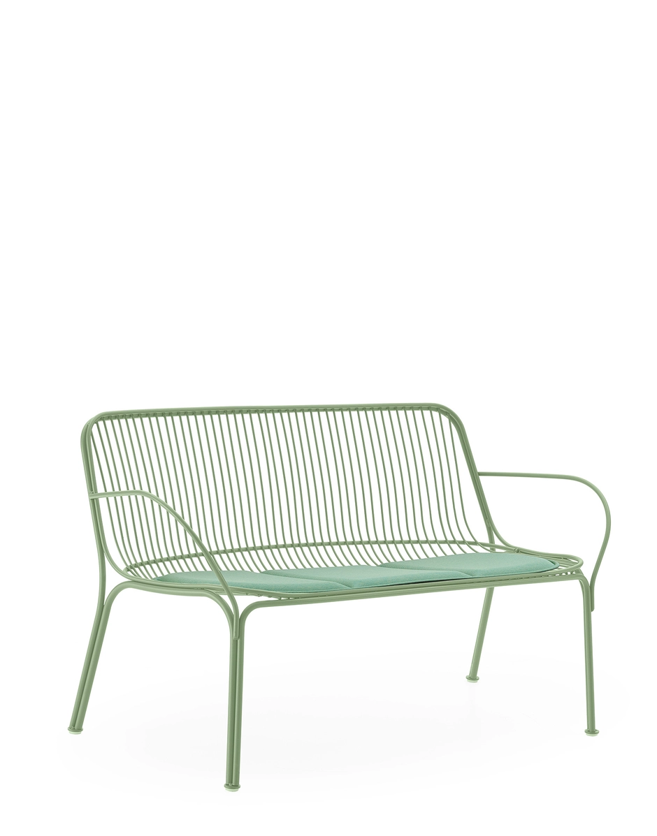 for the greening of the Kartell catalogue, and uses the welded wire process to shape it. The result is an essential and functional product that is nevertheless rich in emotion. Metal wires form well-defined yet lightweight structural parts of the collection’s chair, chair with arms, bistro table, armchair, divan and side table. The various articles come in white, Bordeaux, black and green.
