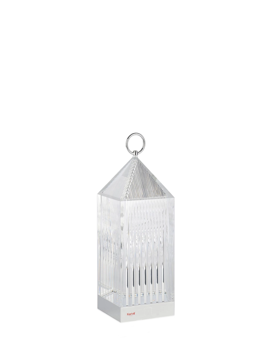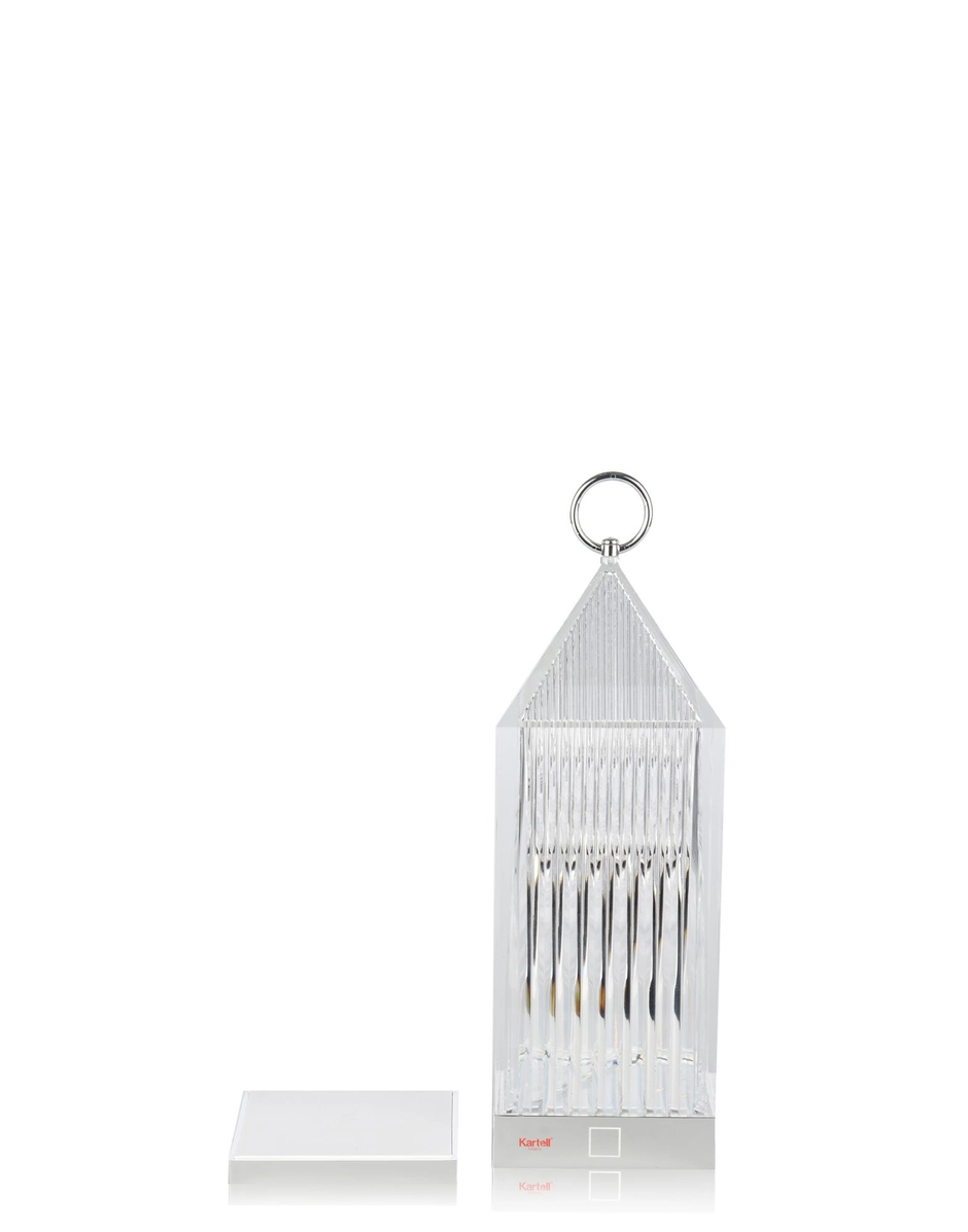 Lantern is an original portable LED, transparent, “chargeable”, injection moulded lamp that charges by placing it onto a charging base. The light is projected by a graphic effect of the design.
