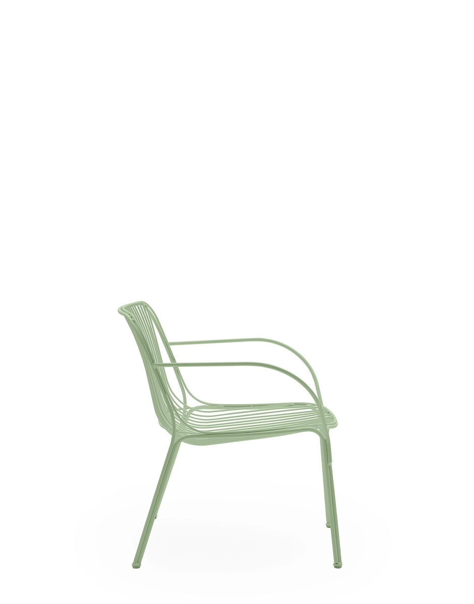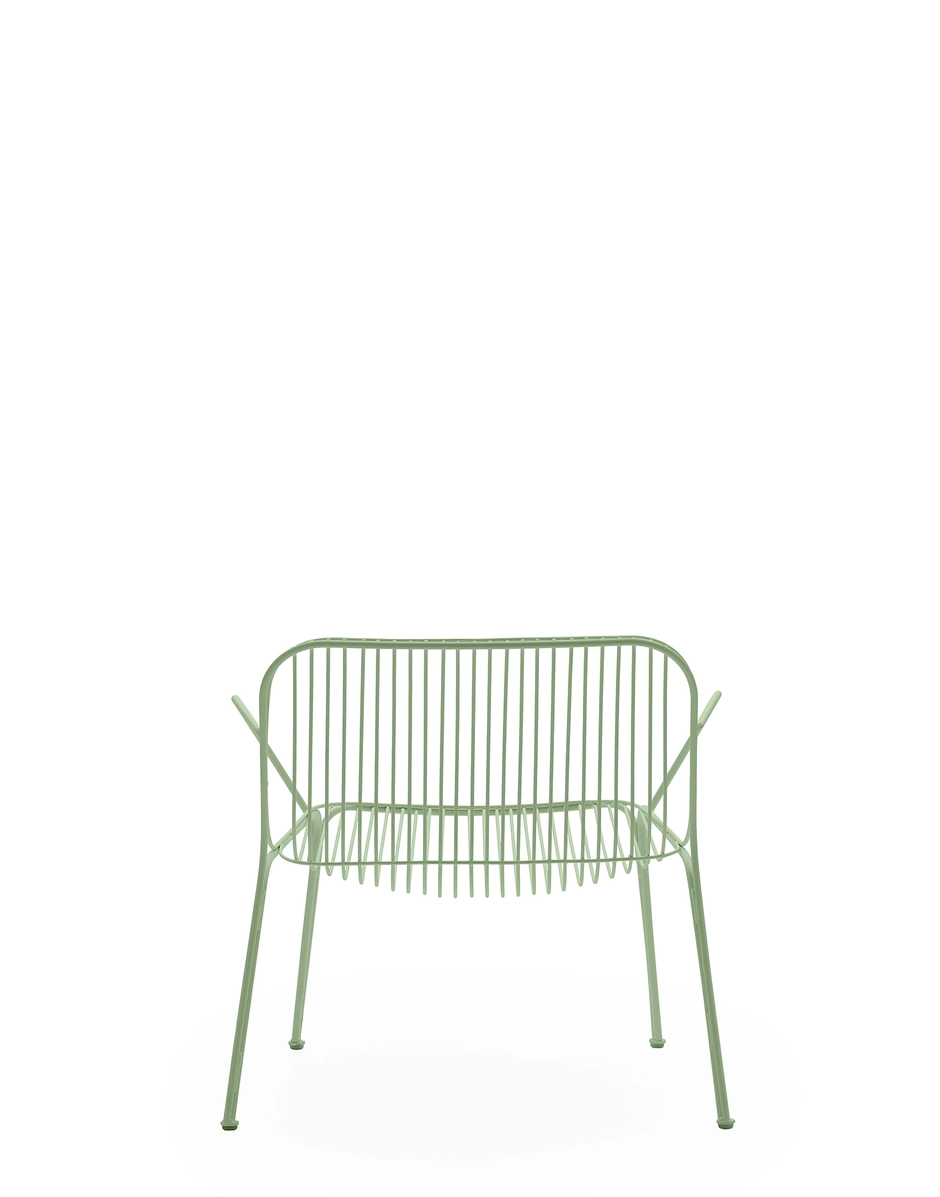 HIRAY juega con el metal, uno de los materiales más importantes en la redefinición ecológica del catálogo de Kartell, que se trabaja con la técnica del alambre soldado. El resultado son unos rasgos esenciales y funcionales, a la vez que cargados de emociones. Con alambres se diseñan piezas de estructura bien definida, a la vez que ligera: silla, silla con reposabrazos, mesita bistró, sillón, sofá y mesa auxiliar. Los colores de la colección son blanco, burdeos, negro y verde.