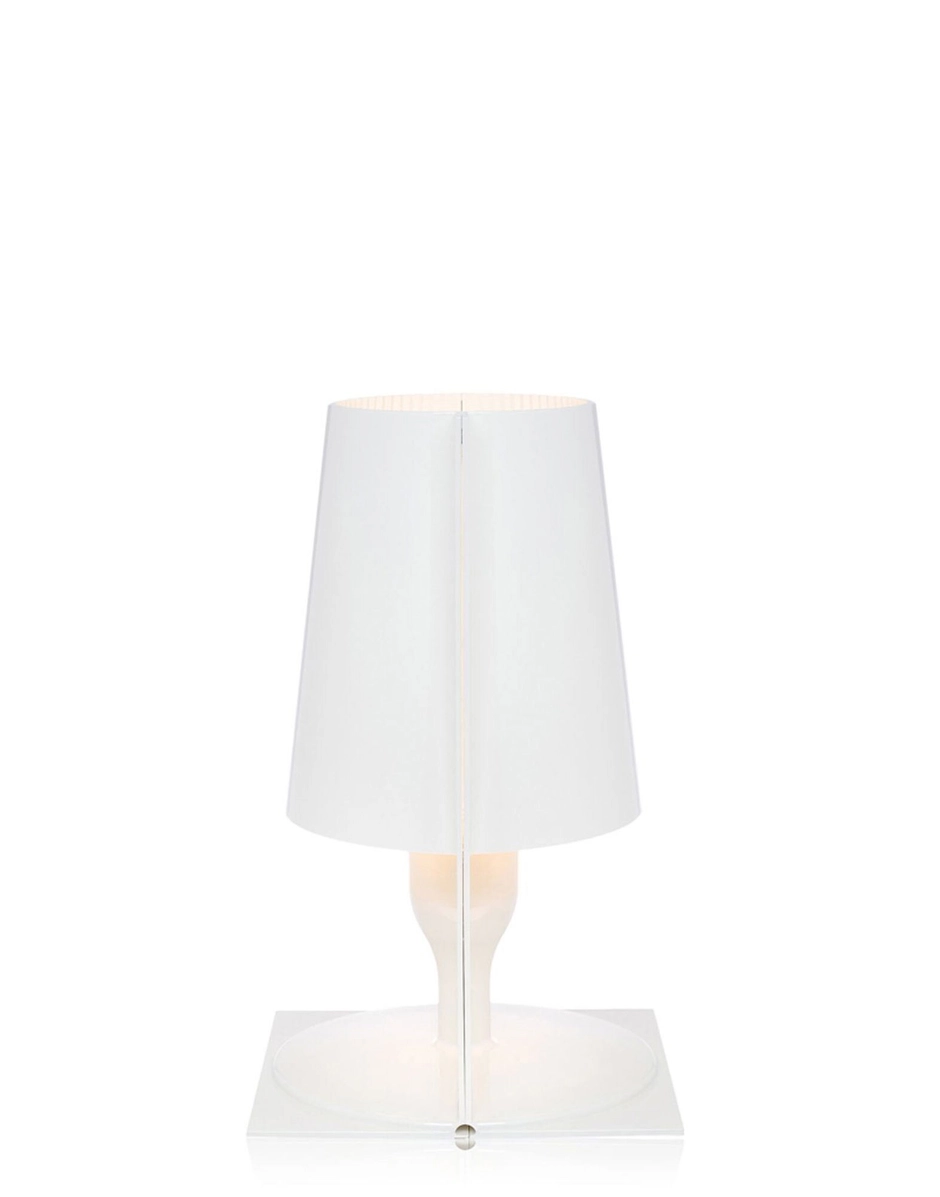 The classic icon of the bedside lamp is revisited by Kartell's technology to become an industrial product in a variety of colour shades. The shape of Take is the result of the joining of two specular parts: two flat, rectangular sheets which, from being two-dimensional at the centre, take on the shape and volume of a "semi-lamp". The internal pleating of the diffuser embellishes the object, creating, when lit, a play of reflections.