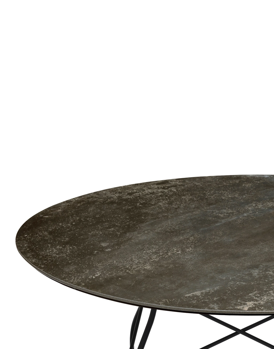 A family of tables ideal for the home and office. The light steel structure is made particular by the use of the cross element that joins the legs on each of the four sides, supporting the top. The collection comprises square, oval and round versions.