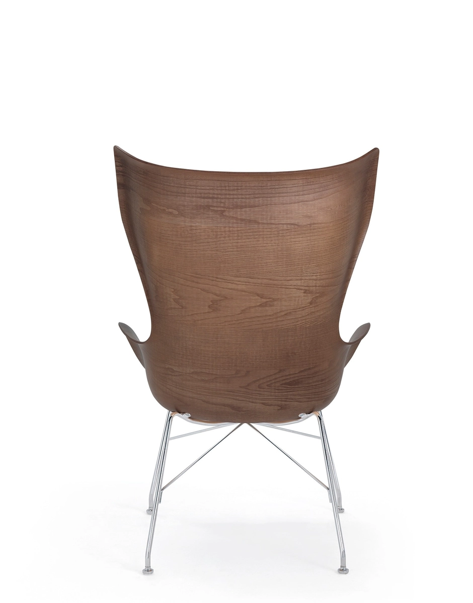 Kartell s'engage constamment dans la recherche ce qui l'a amené à créer des produits en 3D qui n'avaient été réalisés jusqu'à présent qu'en 2D. C'est ainsi qu'a vu le jour la collection Smart Wood. Faisant appel à une technique spéciale brevetée, le bois est en fait moulé ce qui permet de cintrer au maximum le panneau pour créer une coque d’assise aux lignes sinueuses. K/Wood est le fauteuil de style royal, complété par S/Wood, le repose-pieds aux finitions assorties.