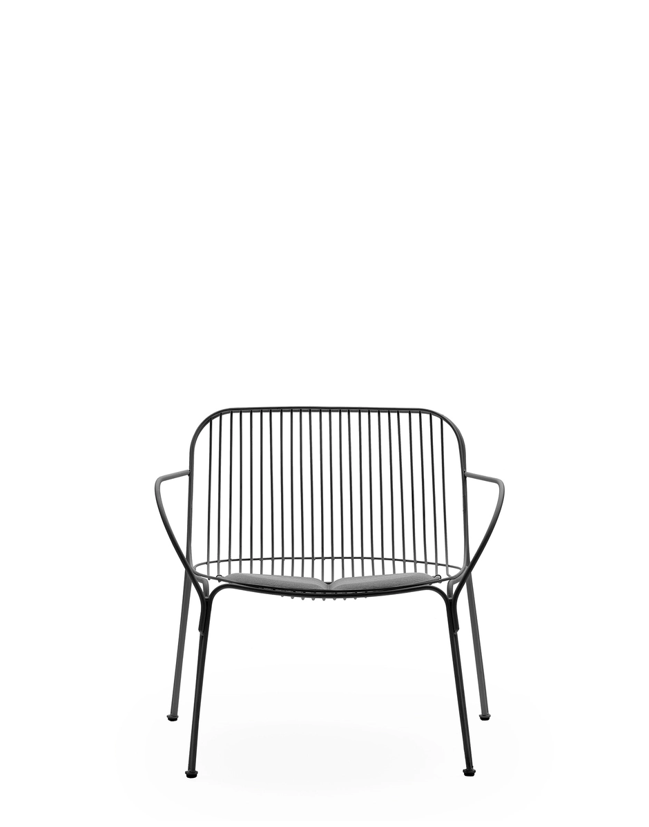 for the greening of the Kartell catalogue, and uses the welded wire process to shape it. The result is an essential and functional product that is nevertheless rich in emotion. Metal wires form well-defined yet lightweight structural parts of the collection’s chair, chair with arms, bistro table, armchair, divan and side table. The various articles come in white, Bordeaux, black and green.