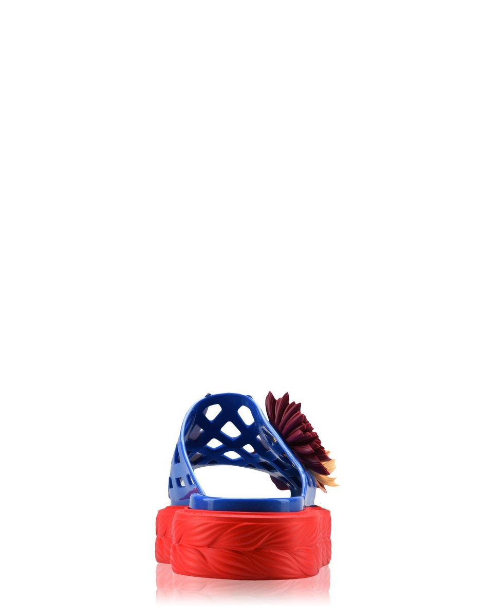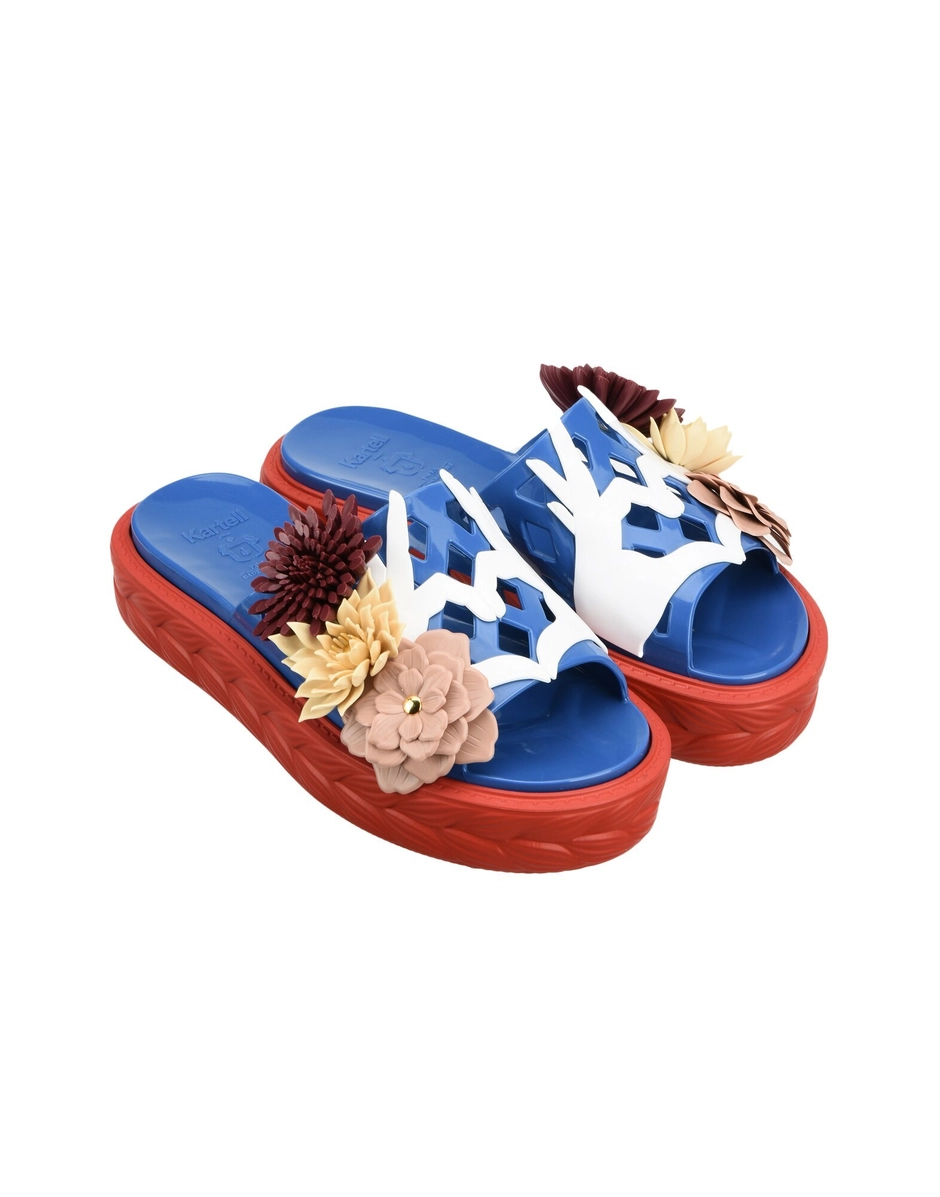 The Claudia sandal comes in different colour variants. The motif consisting of two hands joined in a heart shape characterizes the upper band, to which three-dimensional artificial flowers have been affixed.
