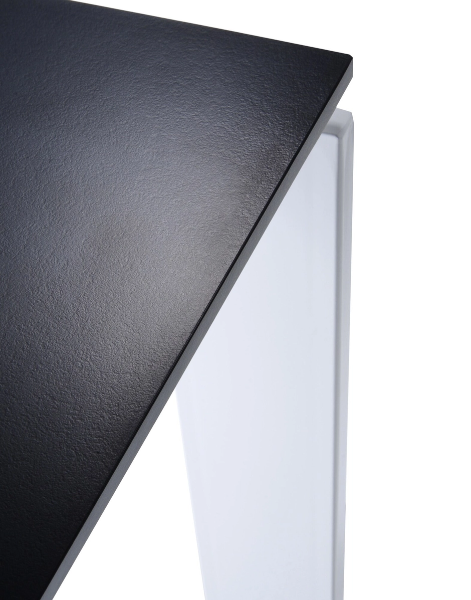 This functional and refined table also has a strict geometric design. Thanks to the elegant design solution, the position of the slim table top allows for the convenient positioning of drawers or storage furnishings for computer hardware. They can be placed side-by-side to form office workstations.