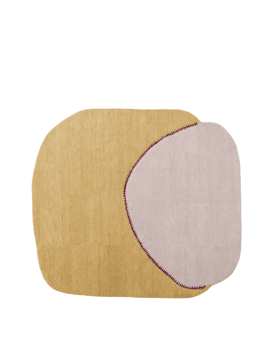 The AALAND rugs are characterized by a particularly original and distinctive graphic pattern. The design consists of two organic rounded shapes, each with different fills and textures, creating an interesting visual contrast. These two shapes, while maintaining some visual independence, are connected by a graphic element that can be interpreted as a sort of stylized suture.