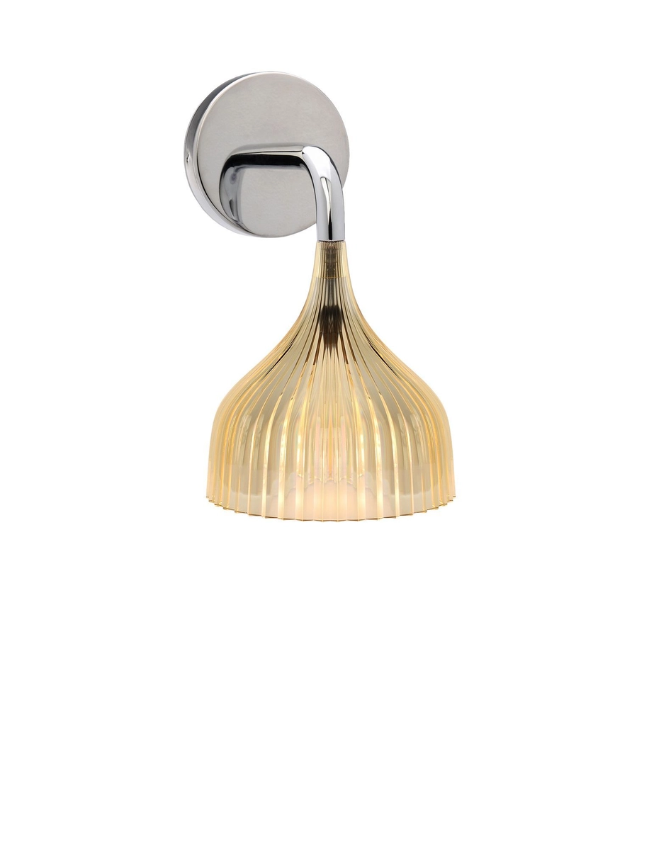 A lamp of simple and essential design, available in two versions, wall sconce and suspension lamp. The wall sconce is composed of a rosette lampshade in pleated available in several colours with an 11 cm chrome arm. The É suspension lamp consists of a pleated lampshade and a chrome rosette. The cable can be adjusted in height from 20 to 220 cm. Both versions take a 40 Watt light-bulb.