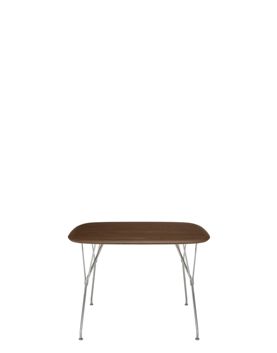 VISCOUNT OF WOOD tables are the latest addition. These naturally composed tables complement the collection's choice of seats and create a sustainable living area in which wood plays a central role thanks to its lightweight properties. These large items of furniture feature top-quality materials and advanced manufacturing technology. The square and rectangular versions with four legs come in five sizes (100x100, 145x80, 160x90, 190x90 and 240x100) and three top finishes: light ash with two darker shades, flamed walnut and a third, characterised by thin strips of different tones of dark wood. The legs are in chrome or black.