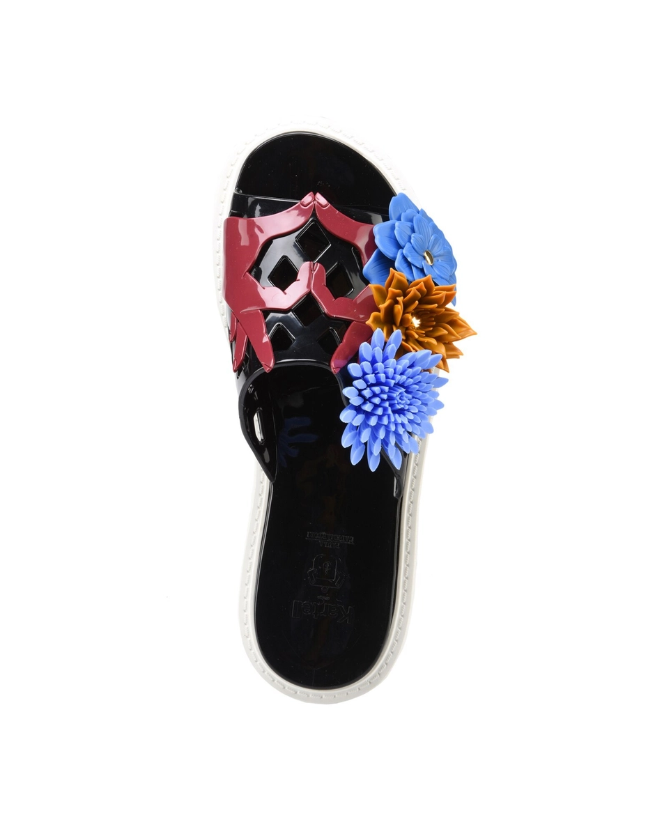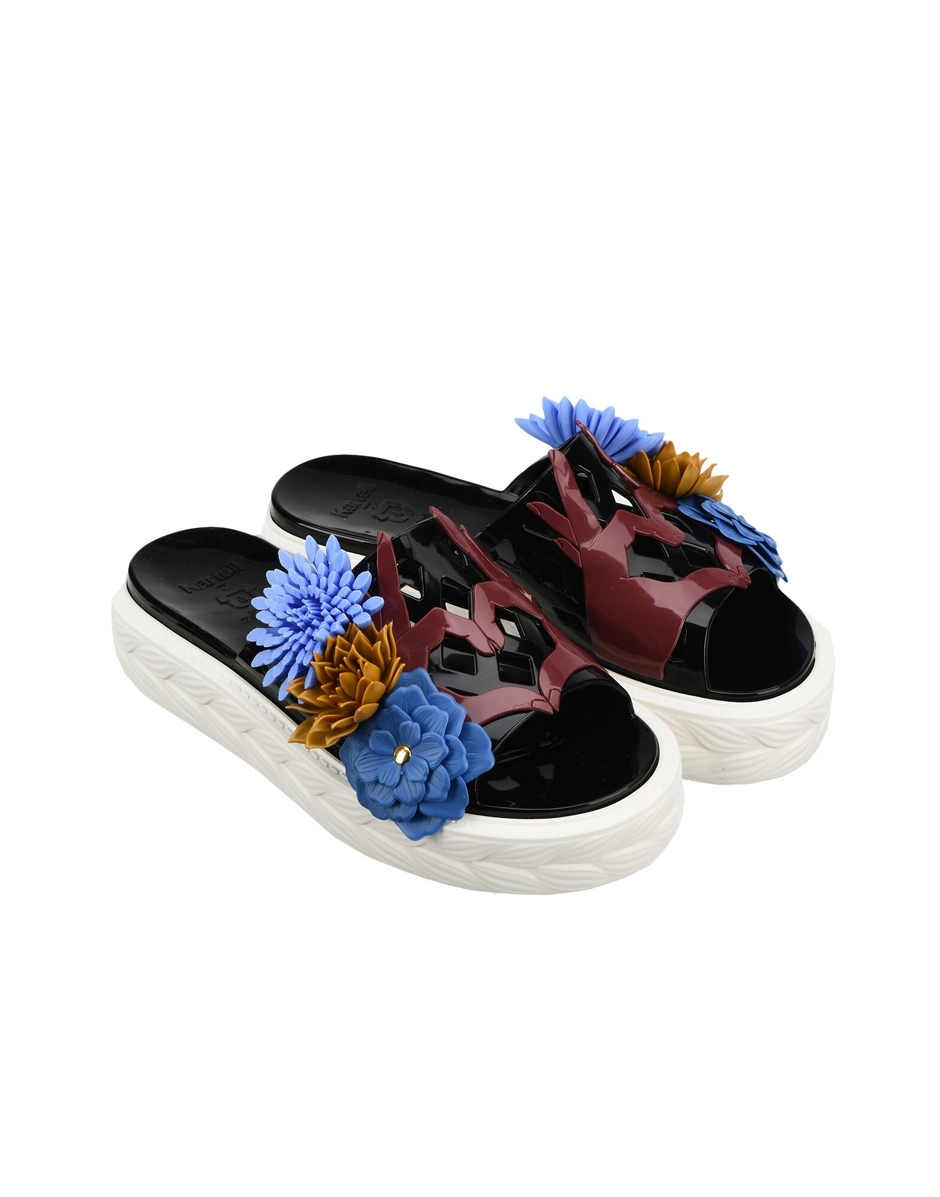 The Claudia sandal comes in different colour variants. The motif consisting of two hands joined in a heart shape characterizes the upper band, to which three-dimensional artificial flowers have been affixed.